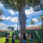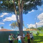 Hoje, as crianças aprenderam sobre a importância do meio ambiente e, para mostrar seu carinho e respeito pela natureza, deram um abraço na árvore. 🌳💚