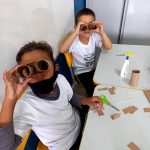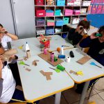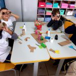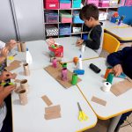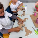 Essa atividade as crianças estão fazendo, elas reaproveitaram esse papelão e rolinho de papel higiênico para construir brinquedo . Essas atividade dão asas à imaginação e envolve a criança no mundo mágico.
