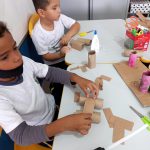 Nossas crianças da Educação Infantil, realizando as atividades com papelão que seria jogado fora, no lixo ou no meio ambiente. A s crianças trouxeram esse material de casa.