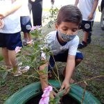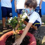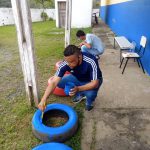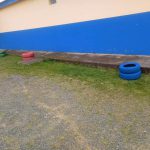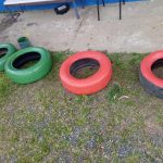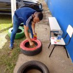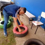Preparando os pneus que pegamos no entulho na rua,  furamos eles para dar para a água passar, pintamos e colocamos terra para que os nossos lindos alunos viessem plantar as flores para deixar a nossa ainda mais linda.