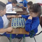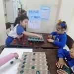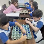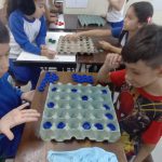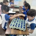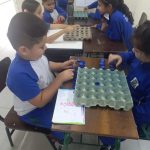 Aproveitando o gancho a professora explicou e reaproveitou esses materiais (bandeja de ovos e tampinhas) para associar os conteúdos de matemática. Então os alunos com auxílio confeccionaram o jogo “resta um”, foi momento de conscientização ambiental, aprendizagem matemática e muita diversão.