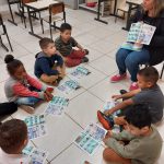 Em seguida realizamos a leitura do gibi UM VOO NA VIA DA HISTÓRIA DA MOBIBILADADE, onde observaram as imagens da história do trânsito.