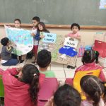 Desenvolvimento: Durante a roda da conversa, conversamos sobre o que é um rio limpo e o rio sujo, escutamos o que cada aluno imaginava o que seria. Depois através de imagens mostramos um rio poluído, o qual eles puderam observar a poluição do rio, com garrafas, sacos plásticos, caixas de sucos …(aproveitamos e falamos sobre a reciclagem ) e depois mostramos como é um rio com águas cristalinas (limpo sem sujeira), e pedimos para eles falarem qual eles gostam mais. Fizemos um conscientização de como devemos cuidar do nosso ambiente, o qual eles expuseram suas ideias e através dessa discussão, confeccionamos juntos um cartaz coletivo com um rio totalmente poluído e um limpo.