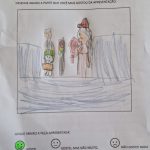 Desenvolvimento da atividade proposta: ilustração da parte que mais gostou da história e sua opinião sobre a peça teatral “O encontro”.