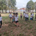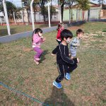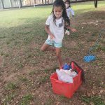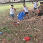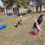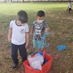 A criança atravessa de um lado para o outro, parando no meio da rua, pegando um objeto por vez e levando até o outro lado.