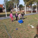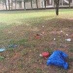 O chão é marcado com fita crepe, simulando a calçada.  Vários brinquedos e papéis são espalhados pela rua.  A rua ficou suja.