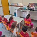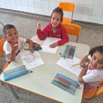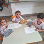 A professora iniciou a aula mostrando aos alunos as figuras dos animais que fazem parte da Turminha da Floresta. Depois, em vídeo apresentou cada animal aos alunos (onça-parda, lobo Guará mico-leão-dourado, gato-do-mato pequeno, onça-pintada, papagaio-do-peito-pintado, arara, gralha azul). Em outro momento, leu a história: “Estamos por um fio”, disponível na revista Zé Quest. Após a leitura, conversamos sobre os resíduos que podem ser reciclados e quais lixeiras devem ser jogados, para finalizar confeccionamos um cartaz com as figuras dos personagens da Turminha da Floresta que cada aluno pintou.