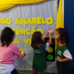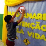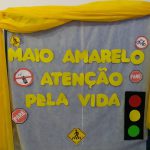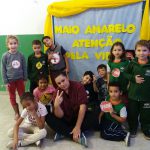 Numa roda de conversa a professora instigou os estudantes a debaterem sobre o trânsito, partindo dos conhecimentos prévios. Na decorrência da aula apresentou algumas placas questionando se sabiam para que servia e onde poderiam encontrá-las. A professora solicitou que trouxessem gravuras de placas de trânsito na aula posterior para confecção das placas em grupo. Após prontas as placas montaram o painel “Maio Amarelo”. Este ficou exposto na escola no mês de maio e início de Junho. O painel foi observado em média por 350 pessoas entre estudantes, funcionários, pais e visitantes.