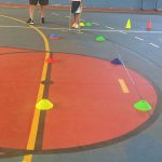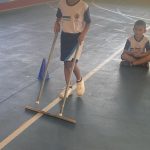 Orientação sobre segurança no trânsito onde os alunos praticaram um trajeto com cabo de vassoura simulando uma rua  dirigindo e sendo orientado.