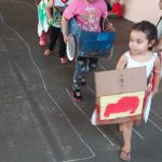 Fizemos carrinhos com caixa de papelão, as crianças pintaram com tinta guache essas caixas, depois colamos as rodas que eram feitas de pratos usados, as crianças amaram confeccionar os carros.