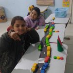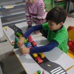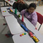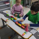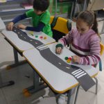 Após a introdução, os alunos construíram uma via de transporte com sinalização usando tampinhas para representar os semáforos. Também realizaram uma atividade de dobradura para confeccionar cones de trânsito, tornando o aprendizado prático e dinâmico.