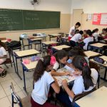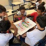 Os alunos foram divididos em grupos para que pudessem jogar a trilha do trânsito.