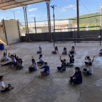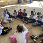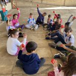 Atividade: os alunos estavam em círculo, foram distribuídas 3 bolinhas de plástico para cada aluno, sendo: 1 vermelha, 1 amarela e 1 verde. A professora mostrou as 3 bolinhas para os alunos, colocando-as na ordem que ficam no semáforo e pediu para eles dizerem o significado de cada cor, sendo que todos concordaram que: Vermelho = PARE, Amarelo = ATENÇÃO e Verde = SIGA. Pedindo para os alunos prestarem atenção, a professora ia falando: PARE ou ATENÇÃO ou SIGA e os alunos deveriam mostrar a bolinha da cor que representa cada ação no trânsito.