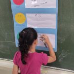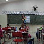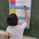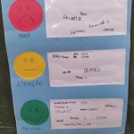 Depois, foram usados as cores do semáforo para que cada aluno fizesse uma auto avaliação sobre si nesse dia, colocando seu nome na terjeta.