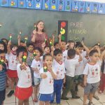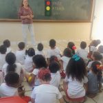 Para casa: Os alunos levaram o semáforo no palito e o panfleto. Uma mãe relatou que sua filha está adorando aprender as músicas do trânsito.