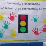 O desenvolvimento foi pintar as mãos com as cores do semáforo e construir um cartaz e depois conversar sobre a temática.