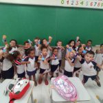 Contei a história “A gotinha Plim-Plim”, em seguida propus aos alunos uma roda de conversa sobre ela, fazendo questionamentos sobre o que entenderam da história, entre outros pertinentes. Escrevi na lousa as palavras ÁGUA e PLIM PLIM, retomei o nome de cada letra, o som que elas produzem juntas, depois entreguei o alfabeto móvel para que os alunos montassem-as. Retomei a história da Gotinha Plim-Plim e tudo o que aprendemos sobre a água durante a semana através de uma competição de perguntas e respostas, separando a turma em duas equipes e com direito a torta na cara.