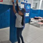 Professora Cleia (Arte) distribuindo os cartazes confeccionados pelos alunos.