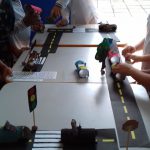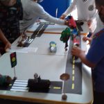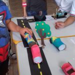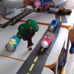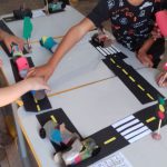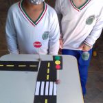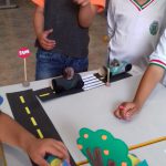 Após as atividades anteriores, aproveitando o material reciclável solicitado na semana anterior, os alunos confeccionaram seus carrinhos e brincaram na pista respeitando a sinalização.