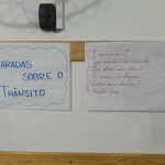 Em seguida, os alunos foram convidados a elaborar um texto com dicas sobre trânsito seguro, permitindo que registrassem ideias importantes para a prevenção de acidentes e a promoção da segurança. A participação foi ativa, demonstrando interesse e compreensão sobre a relevância de atitudes responsáveis no trânsito. Cada aluno apresentou ao grande grupo suas produções.