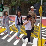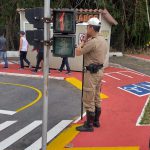 Policial apresentando na prática algumas regras de trânsito