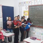 No dia combinado, as crianças que realizaram a tarefa de casa solicitada (entrevista) foram à frente da sala para socializarmos quem haviam entrevistado e as respostas obtidas.