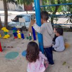 A partir da criatividade da professora Valentina, incentivamos as crianças a participarem da construção de uma cidade em miniatura, com galhos de árvores, lego, carrinhos, aviões, motos. Dessa forma, as crianças tiveram contato com diferentes meios de transporte e puderam vivenciar uma simulação de como eles se locomovem pela cidade. A colaboração e a imaginação foi surpreendente, ninguém queria trombar com um “prédio” e derrubá-lo, não houve nenhuma simulação de acidente nem mesmo por parte dos alunos, demonstrando respeito e empatia pelos outros.