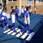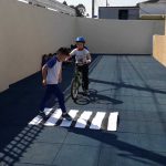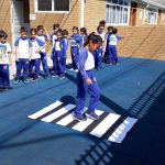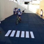 Construí uma faixa de pedestre para que pudéssemos simular uma travessia, com uma bicicleta os alunos deveriam fazer de conta que era um carro. Os educandos podem atravessar na faixa mas devem antes olhar para dois lados percebendo que havia vindo o carro devem parar e esperar. Mesmo quem estava na bike deve para quando chegar a faixa de pedestre e ver um ou mais pedestres que já iniciaram a travessia. Foi bem gratificante ver os aluninhos entenderem os cuidados no trânsito;