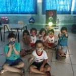 Utilizando caixa de papelão reciclável e papel celofane, a professora fez um semáforo com as cores: vermelho, amarelo e verde, e com as luzes da sala apagada e uma lanterna iluminando o semáforo, os alunos se atentavam para a cor iluminada e realizavam o comando que corresponde. No momento do vermelho aceso, todos deveriam parar. Quando o verde era aceso, todos podiam caminhar pela sala, e ao acender o amarelo, todos faziam sinal de atenção com as mãos, pois logo o sinal iria fechar.