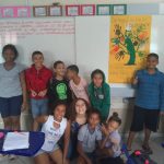 Os alunos confeccionaram uma árvore com galhos feitos com tinta desenhando as suas mãos.