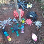 4ª etapa: Exposição dos bichos recicláveis: Abelhas – feitas como rolo de papel higiênico e restos de E.V.A. A tartaruga, a aranha e o sapo foram feitos com garrafa pet. A minhoca com meia velha. E a lagarta com caixa de ovos.
