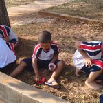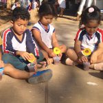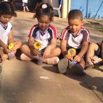 Aqui as crianças confeccionaram um girassol feito de pauzinho de picolé e forminha de docinho. Depois, encheram um copinho descartável de terra e “plantaram” o girassol.