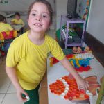 Alunos do pré II na produção do peixe com tampinha de garrafa pet.