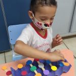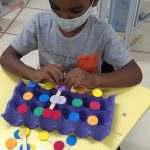 Desenvolvimento: As crianças receberam uma cartela de ovo com bolinhas de EVA coloridas coladas e palitos com 3 bolinhas coloridas. Primeiramente, as crianças exploraram os objetos e depois foram questionadas se há haviam visto os materiais antes em outro contexto. A partir daí, foi explicado que os materiais foram reciclados e agora se tornaram um jogo no qual elas teriam que colocar os palitos nos lugares corretos de acordo com as cores presentes neles.