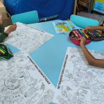 As crianças estão pintando um desenho onde conscientiza  sobre a importância de dirigir com atenção, mostrando que é essencial para garantir a segurança de todos. Respeitando os limites de velocidade, usando sempre o cinto de segurança e mantendo distância do veículo à frente. Evitar usar o celular enquanto dirige e pequenas atitudes responsáveis fazem grande diferença no trânsito.