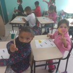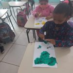 Foram confeccionados mãozinhas com uma esponja para combaterem o mosquito da dengue, a proposta aborda também a aprendizagem de cores