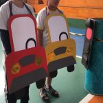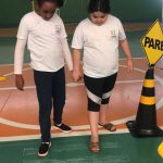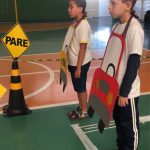 Trabalhamos nas aulas de Educação Física com os alunos de forma lúdica, no espaço da quadra, uma cidade fictícia com ruas, faixas, semáforos e placas de trânsito, sinais horizontais, carros confeccionado em papelão/EVA etc., a conscientização de aprender sobre um trânsito e suas regras, utilizando cones, cordas, bastão, giz entre outros e sobretudo a importância em modificar o espaço onde utilizamos o trânsito no nosso dia a dia.