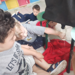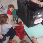 Reutilizamos uma caixa de papelão e transformamos ela em uma vaca, adaptamos uma luva imitando o órgão produtor do leite, perfuramos e colocamos leite para assim as crianças executar a ação de tirar o leite compreendendo assim que o leite não vem da caixinha.