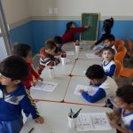 Numa conversa, cada criança expôs qual o meio de transporte faz uso, ganhando assim, a figura correspondente, que eram: ÔNIBUS, VAN, CARRO, MOTO E BICICLETA. Cada criança, colou como se estivéssemos construindo gráficos e no final, contamos as quantidades e o meio de transporte ganhador foi o CARRO. Os alunos desenharam um carro.