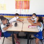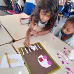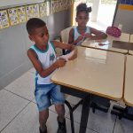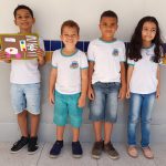Após uma conversa informativa sobre o cotidiano no trânsito, enfatizando o dia do pedestre, a professora dividiu a turma em grupos, orientando-os a realizarem cartazes, ilustrando um trânsito correto.
