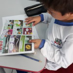 A turma prosseguiu aprendendo e se empolgando ainda mais com o tema ‘Trânsito” e dessa vez buscamos nos materiais didáticos  da “Arteris” os subsídios necessários para o estudo. A leitura da Revistinha de histórias em quadrinhos da turma do Zé Quest, veio a calhar, pois no momento havíamos iniciado os estudos sobre o gênero textual, o que aguçou a curiosidade da turma e os estimulou na busca pela leitura. Descobrimos após, que é necessário muita atenção no trânsito senão podem ocorrer acidentes gravíssimos, por isso decidimos alertar os nossos familiares.