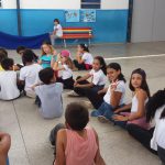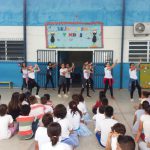 Atividade realizada no Culto à Bandeira com os alunos do 5°ano C, onde apresentaram uma dança com a música Alô Crianças, que aborda respeito as leis de trânsito.