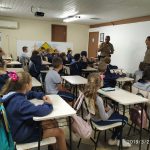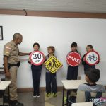 Os Policiais Militares apresentaram o trânsito, explicando sobre as regras e os cuidados a serem tomados, fizeram apresentação das principais placas.