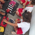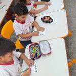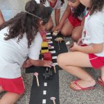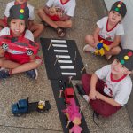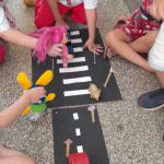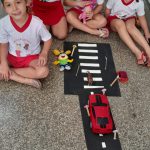 Dinâmicas no pátio da escola, onde será simulado ruas e sinalizações do trânsito, levando as crianças a se familiarizar com regras e situações onde poderão colocar em prática todas as informações aprendidas, interação entre pessoas e veículos.