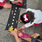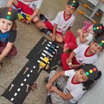 Usando velotrol, bicicletas e carros feitos com caixas de papelão, as crianças encontrarão situações onde já vivenciam no cotidiano de seus dias e nas ruas da cidade. Terão oportunidade de assumir papéis em diferentes situações, pedestres, motoristas, passageiros e condutores.