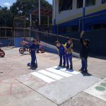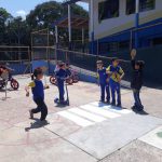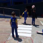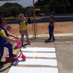 Realizamos um circuito com faixa de pedestre, placas, semáforos, cordas e sinalizações no pátio da escola.