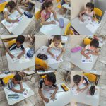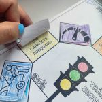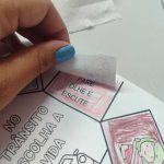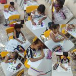 Os alunos recebem um papel para pintar a cena, e em cada parte do desenho, são adicionadas frases explicativas sobre as regras de trânsito.
