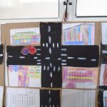 A professora Caroline com a sua turma de Pré escola I confeccionaram um painel sobre o trânsito onde os alunos pintaram utilizando tinta guache e deixaram em exposição na sala de aula, também recortaram figuras referente ao tema para realizar a colagem. Em seguida conversaram sobre os cuidados com o trânsito como: respeitar a sinalização, utilizar o cinto de segurança, crianças no banco traseiro e com cadeirinha, entre outros.