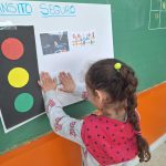 Lembramos de algumas regras básicas como: Uso do Cinto de segurança, atravessar na faixa de pedestre, uso de capacete, respeitar o semáforo… foram muitas as regras lembradas e citadas como praticadas. Em seguida, montamos um cartaz coletivo onde debatemos sobre cada figura escolhida para compor o cartaz e o mesmo ficou exposto no mural da sala. A mensagem que vamos guardar, aprender, praticar e partilhar. Todos por um trânsito mais seguro.