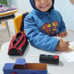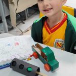 Em seguida, realizei uma atividade artística, na qual cada criança confeccionou um caminhãozinho utilizando caixa de pasta de dente e tampinhas de garrafa PET, explorando a criatividade e reforçando a importância da reciclagem.